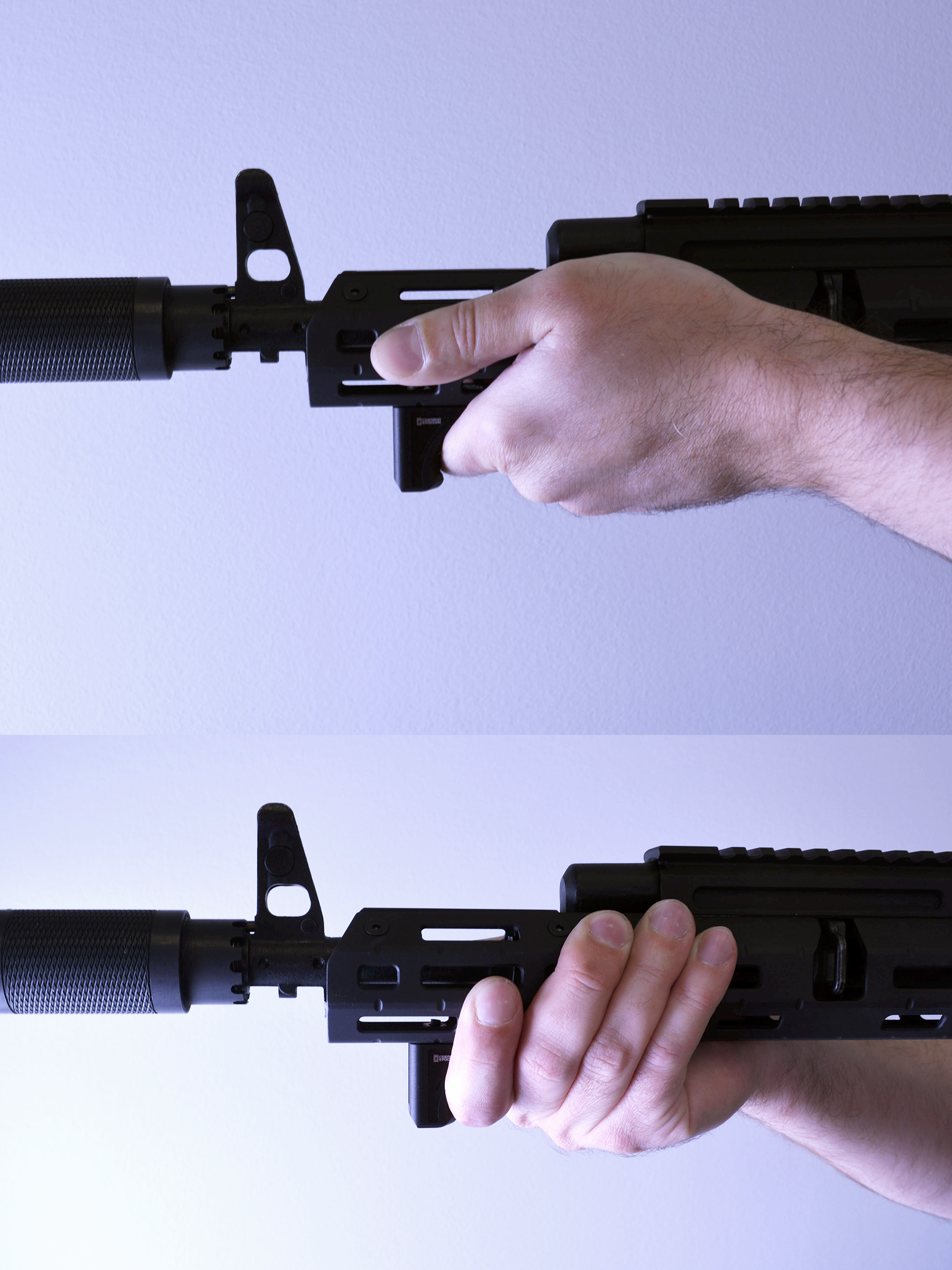 - Форма упора разработана для улучшения контроля над оружием, определяет и фиксирует расположение передней руки.